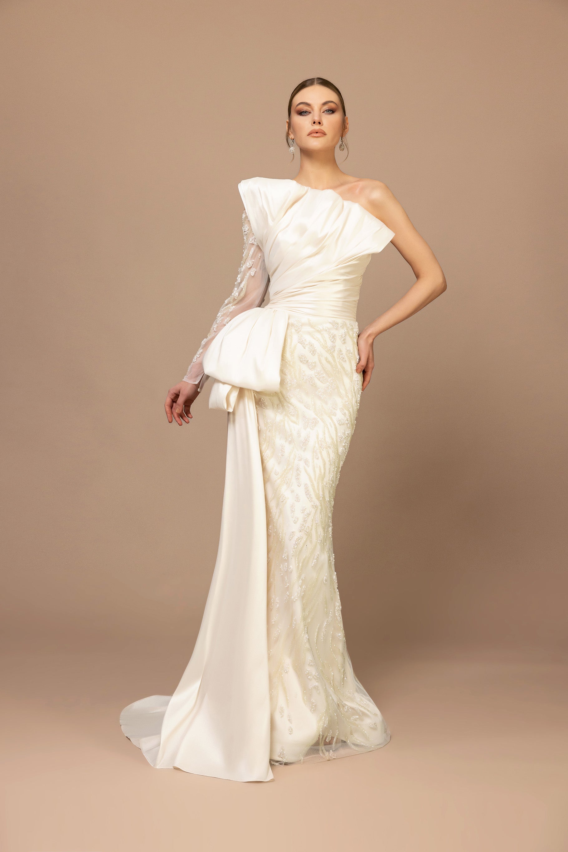 De Amélie-jurk is een elegante strapless jurk met een gedrapeerde kraag en asymmetrische mouwen. Gemaakt van hoogwaardig kralen tule, voegt het een vleugje verfijning toe aan je outfit. Deze jurk is perfect voor speciale gelegenheden. Hij accentueert uw figuur en zorgt voor een verfijnde en moderne look.