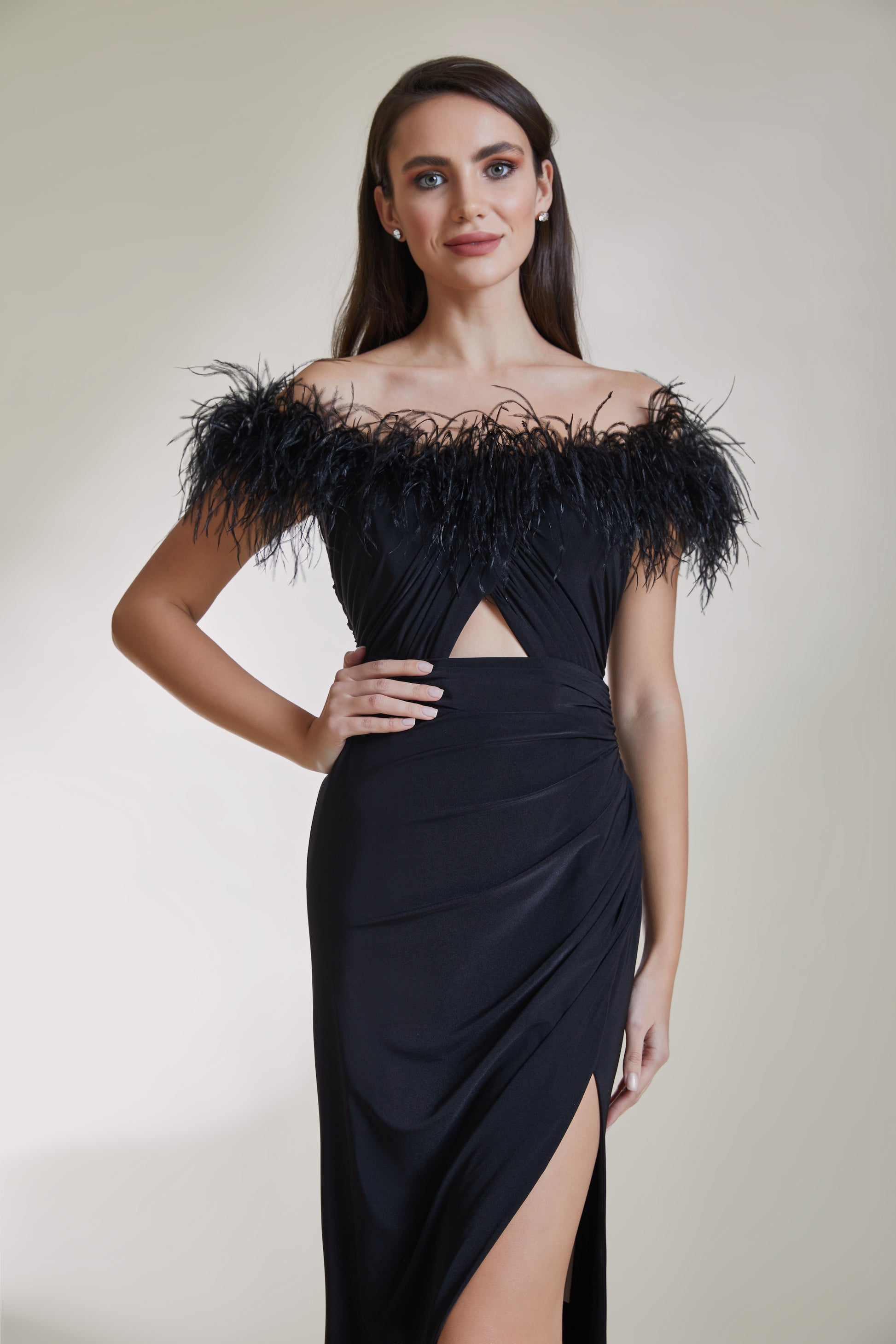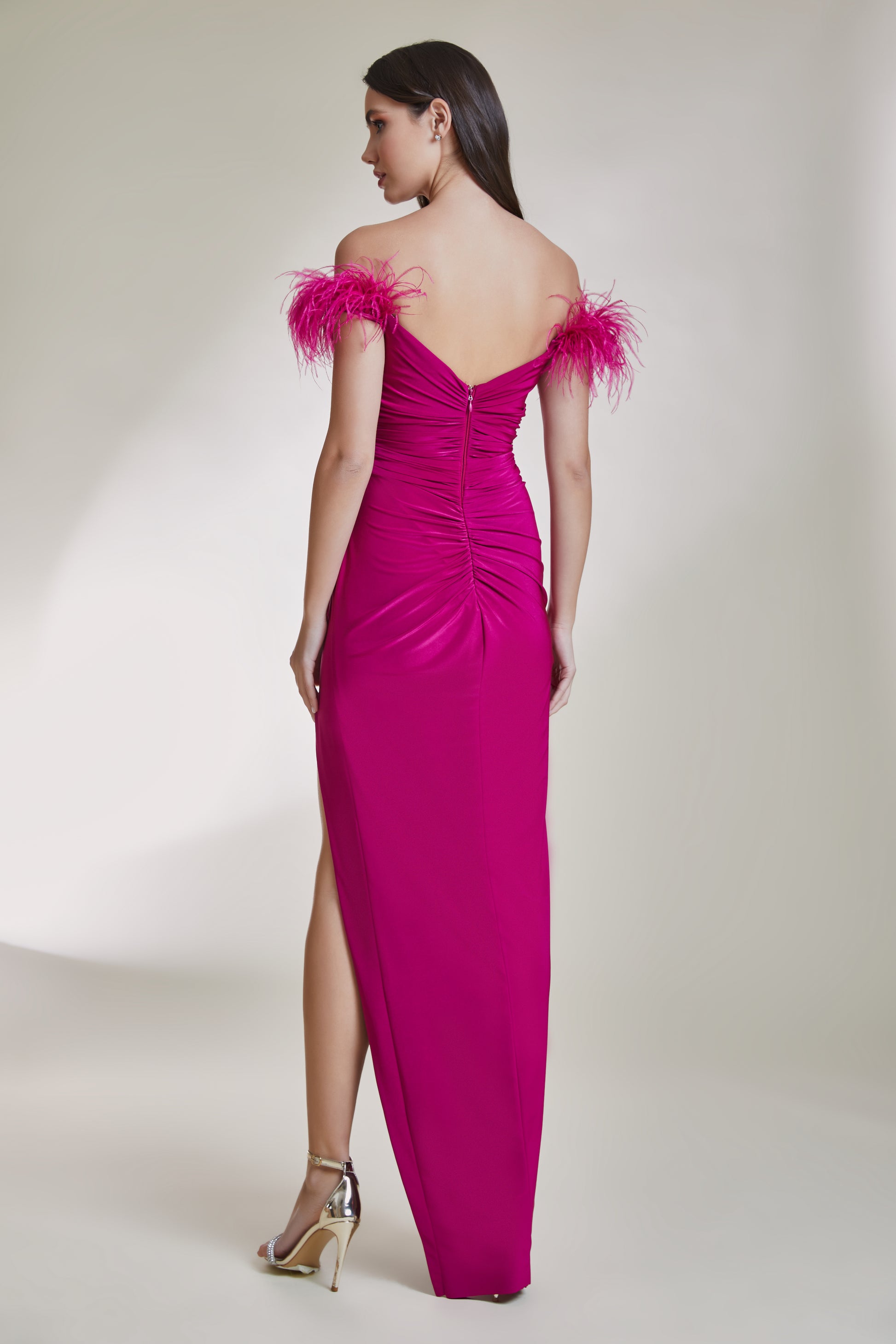 La robe Helena dévoile une épaule élégamment mise en valeur, sublimée par un détail de plume délicat. Sa fente ajoute une touche de sophistication et de liberté de mouvement, idéale pour une allure à la fois raffinée et audacieuse. Conçue pour les occasions où distinction et style se rencontrent, cette pièce allie confort et élégance avec maîtrise.