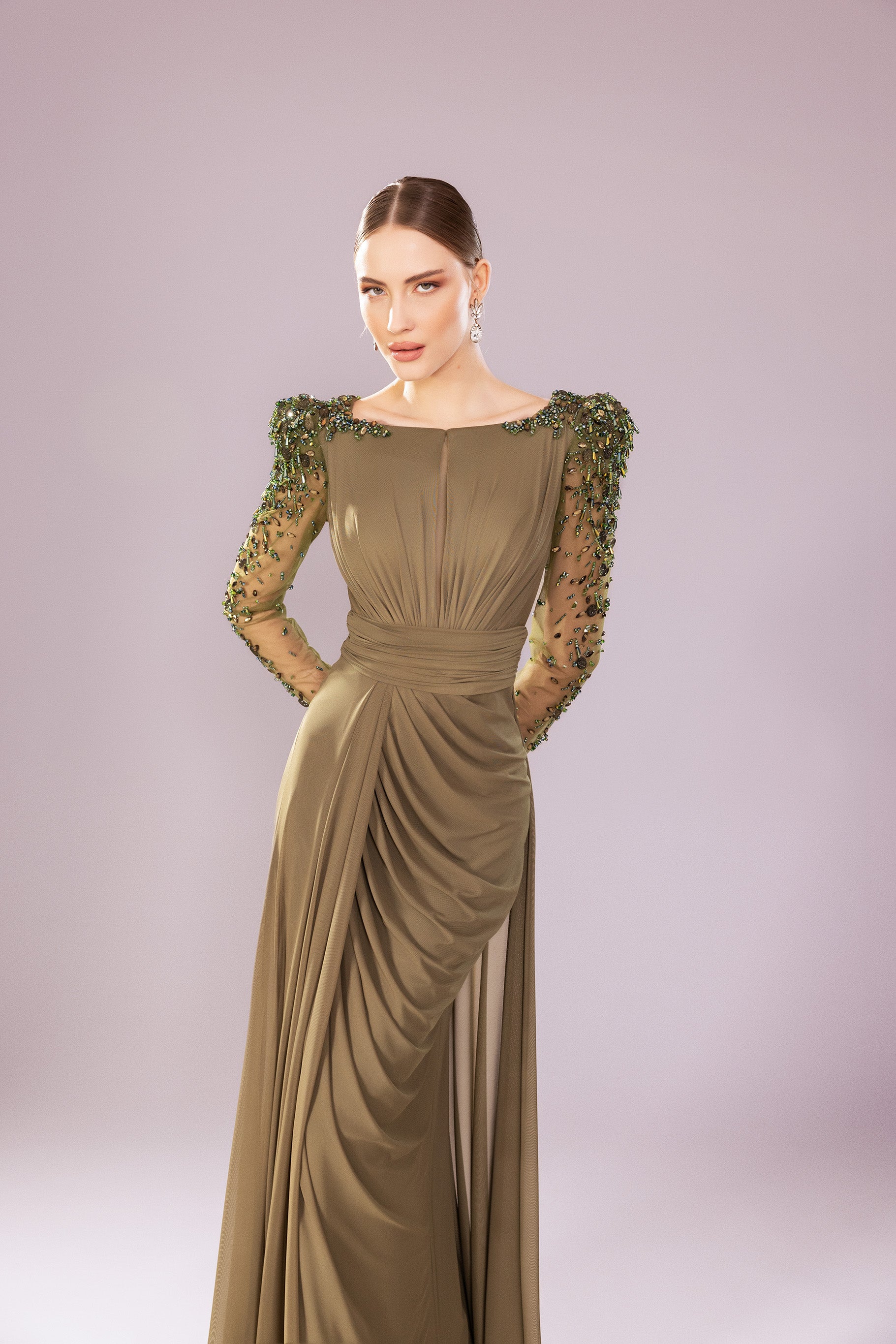 La robe Esmeralda se distingue par ses manches élégamment brodées de cristaux, offrant une touche raffinée et lumineuse. Son col ferme assure une silhouette sophistiquée tandis que la fente apporte une note subtile de modernité et de sensualité, parfaite pour une allure remarquable lors de vos occasions spéciales.