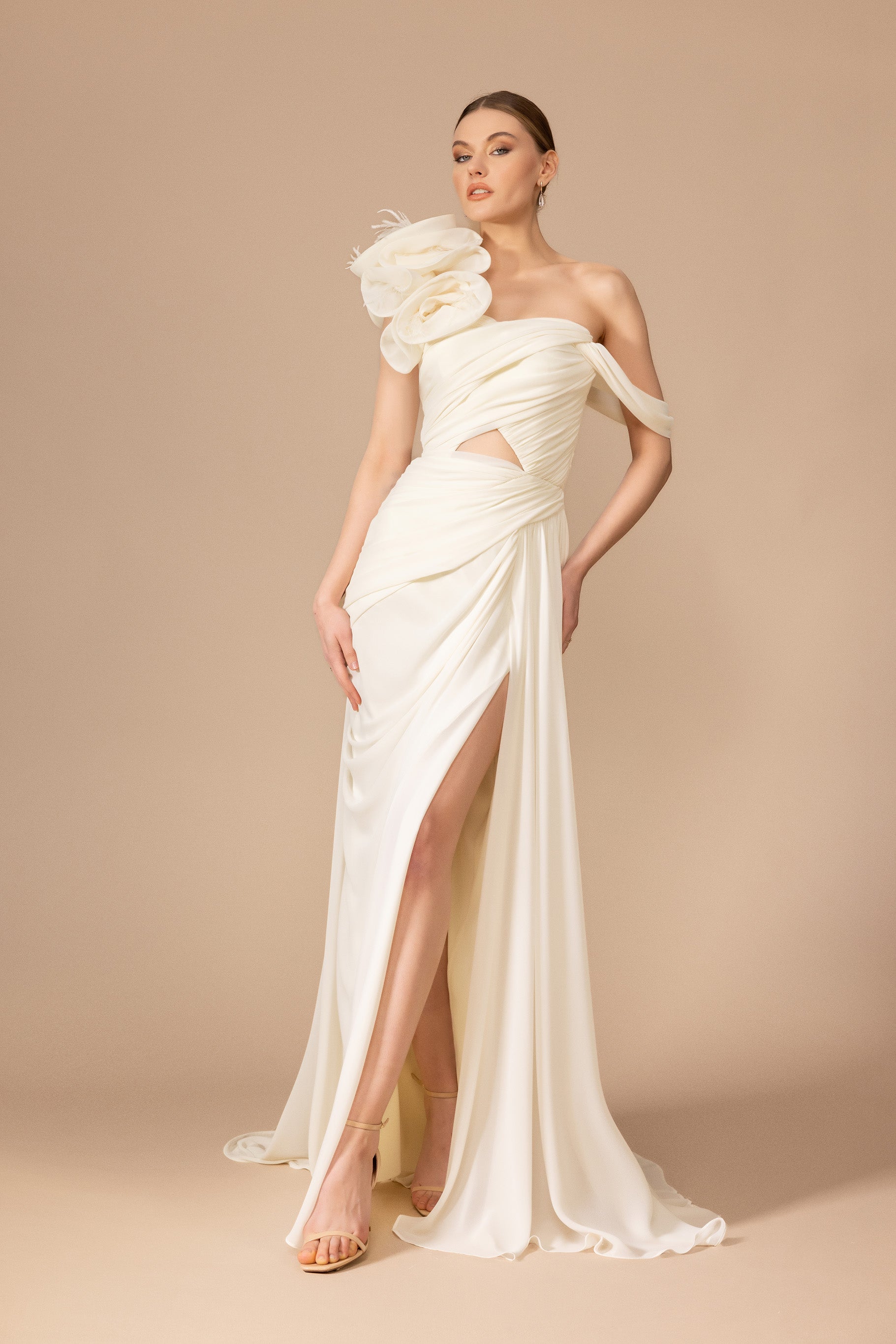 Découvrez la robe Rosalie, faite de chiffon drapé, avec une fente pour un look élégant. Agrémentée d'une grosse fleur sur l'épaule et d'une bretelle tombante pour un style unique. Ajoutez une touche de sophistication à votre garde-robe avec cette robe.